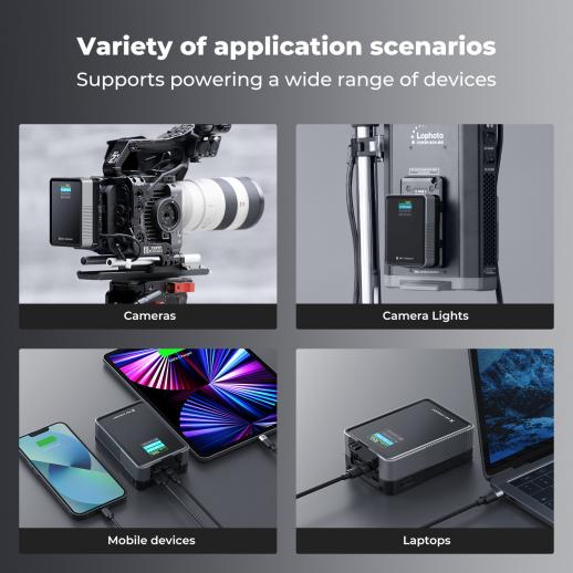 - * 【Múltiplas interfaces para aplicações versáteis】 Equipada com portas USB-C, USB-A, DC 12V, BP e D-TAP, esta bateria V-Lock alimenta vários dispositivos simultaneamente. Perfeita para câmeras DSLR, filmadoras, monitores e muito mais, oferecendo a flexibilidade de manter a bateria ligada no set.